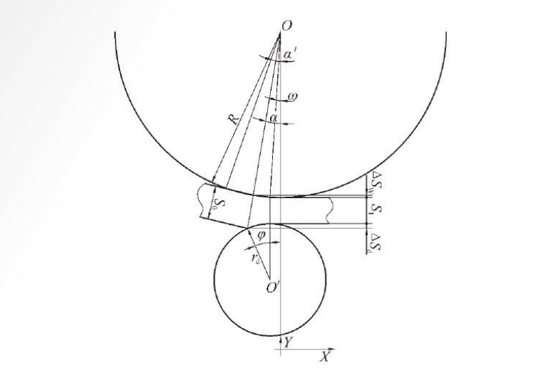 In any X-Y plane of the cross-rolling deformation zone, the geometric relationship among the rolls, internal deformation tools, and the rolled piece, that is, the geometric relationship within the characteristics of the cross-rolling deformation zone is shown in Figure 4.