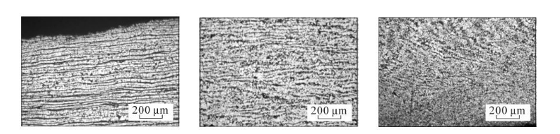 The banded structure grade is rated according to GB/T 13299-1991 "Method for Evaluation of Microstructure of Steel". It can be seen from Figure 2: SA106C seamless steel pipe has banded structure from the inner surface to the middle, and the banded structure grade is from 5 The grade gradually decreases toward grade 2, with the most serious band-like tissue near the inner surface, and gradually decreases in the middle of the wall thickness, while there is no band-like tissue near the outer surface.