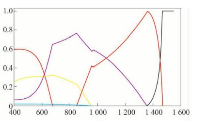 Blue: hexagonal close-packed structure (HCP) yellow: σ phase purple: austenite red: ferrite black: liquid phase