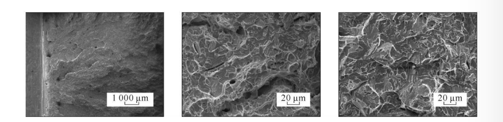 Figure 2 Macroscopic and microscopic morphology of the fracture surface of 08Cr9MoVRE test steel as rolled