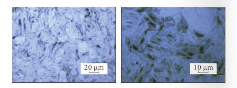 The material has poor plasticity at room temperature, so it is not conducive to cold deformation. Judging from the hardness and impact performance test results, the hardness is around 37 HRC, which makes machining difficult, and the impact toughness is around 40 J, which is close to the technical requirements of L80-9Cr. lower limit. It can be seen from the metallographic structure of the test steel 08Cr9MoVRE under different magnification conditions that the rolled structure of the test steel is lath martensite.