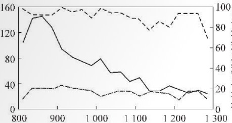 Z=60% is the threshold to divide the high plasticity zone and low plasticity zone of steel. As shown in Figure 4, at 800~1 275 C, 08Cr9MoVRE has good plasticity; at 1 225~1 250 9C, the strength is 26~30 MPa. The lower the temperature, the lower the deformation resistance of the material; at 1 225 ~ 1 250 C, the elongation is greater than 17%, the cross-sectional shrinkage is 94.3%, 92.2%, the material has the lowest strength and the best ductility, and is suitable for perforation deformation.