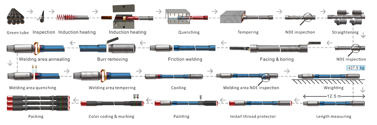 Tool joints are inertia welded to the tubes with computer-monitored precision. Concentricity is carefully monitored and controlled, and the parameters of each weld are electronically recorded, and traceable to each joint. After removal of weld flash, the weld area is austenitized, quenched, and tempered to achieve the required mechanical properties. Heat treat cycles for each weld are compared to specific parameters and recorded for traceability. After all steps and machine marks are polished from the OD and ID area, hardness testing, ultrasonic testing, and wet magnetic particle inspections are used to verify the integrity of each weld zone.
